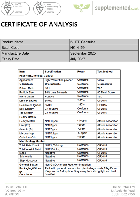 5-HTP 400mg Griffonia Seed 98% Extract, Brown Rice Flour (GF), Bovine Gelatine Capsule Shell