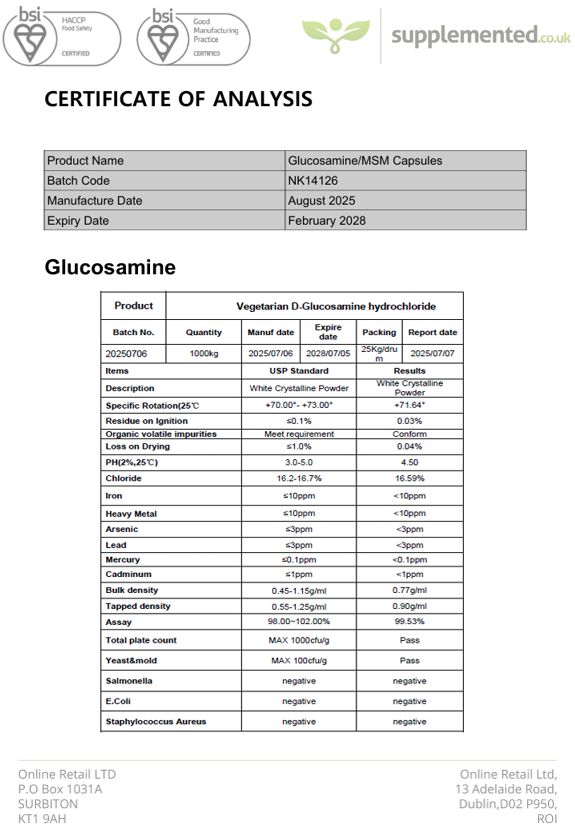 Glucosamine Sulphate 2KCL 400mg, Chondroitin Sulphate 100mg (with collagen, purity not less than 16%), MSM 50mg, Brown Rice Flour, Bovine Gelatine Capsule Shell