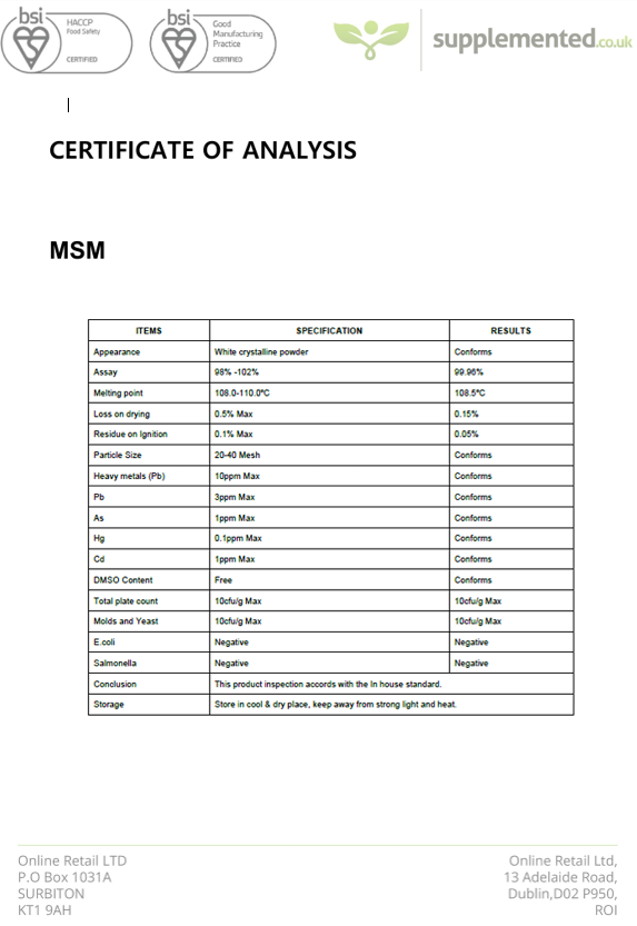 Methyl sulphonyl methane (MSM) is an important component for glucosamine and chondroitin to be absorbed and utilised by the body. This sulfur based compound is also found in plants and other animals. MSM is generally found in most of the food we eat but diminishes significantly during cooking and processing.