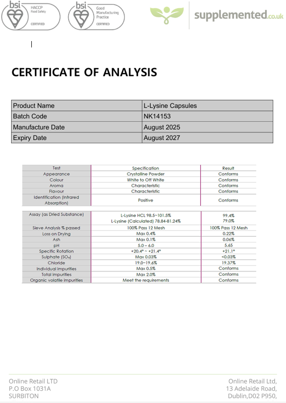 L-Lysine (Free form), Brown Rice Flour (GF), Bovine Gelatine Capsule Shell