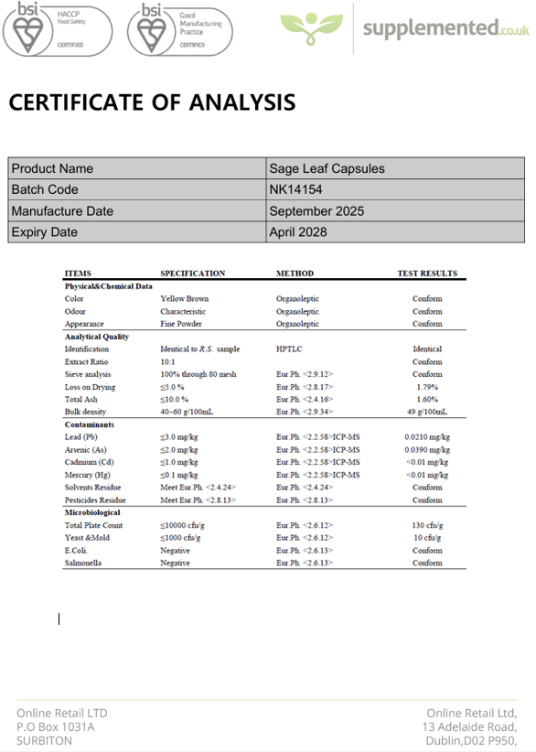 Sage Leaf Extract, Brown Rice Flour (GF), Bovine Gelatine Capsule Shell