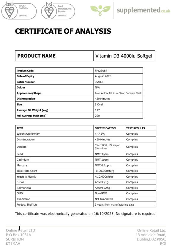 (Soya Bean Oil), Shell (Bovine gelatin, Glycerine, Purified Water), Vitamin D3 Oil (Medium Chain Triglycerides, Vitamin E (as dl-Alpha Tocopherol), Vitamin D3 (as Cholecalciferol)).
